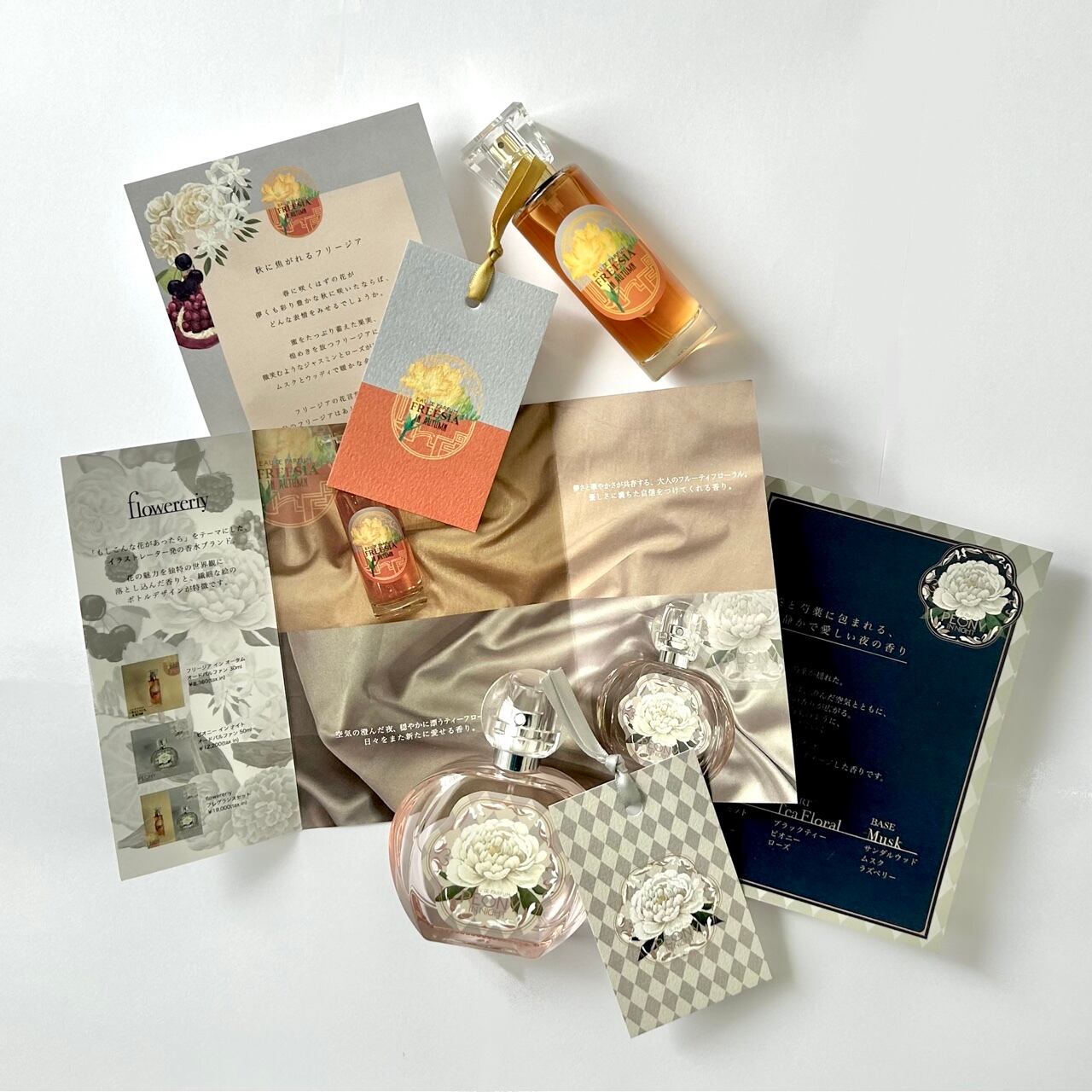 フリージア イン オータム オードパルファンとピオニー イン ナイト オードパルファンの2種類の香りをムエット(試香紙)に吹き付け、封筒に入れてお届けいたします。